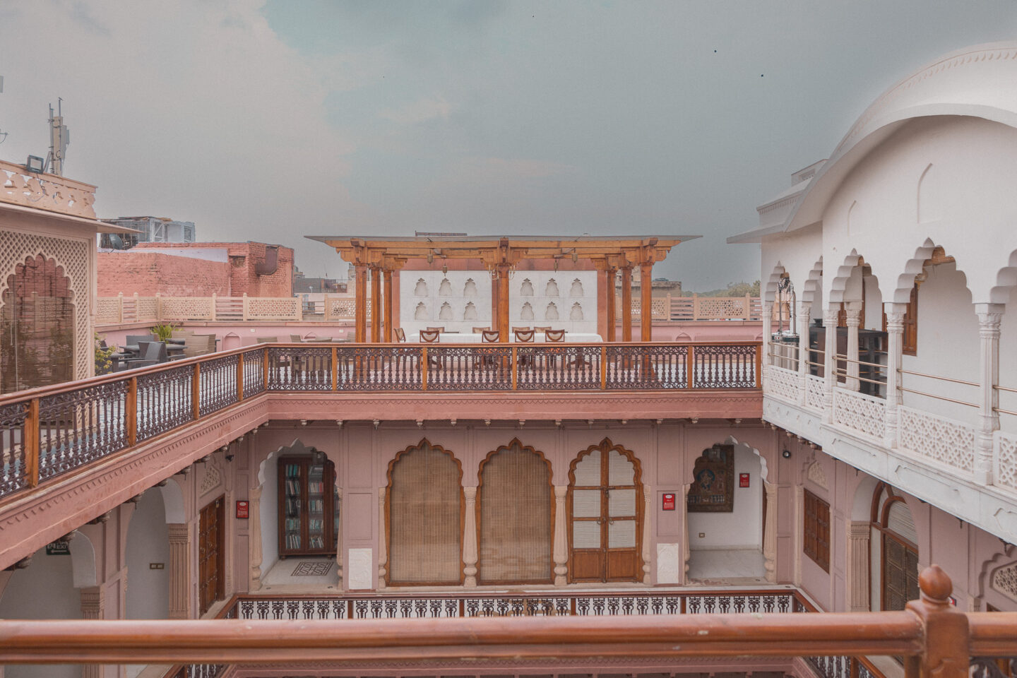 Finding it is half the adventure — winding through narrow lanes, weaving past spice markets, honking rickshaws, and street vendors. When you finally reach the discreet entrance, the door opens into an oasis of calm courtyards, arched balconies, and intricate jharokhas, a stunning contrast to the bustle outside.